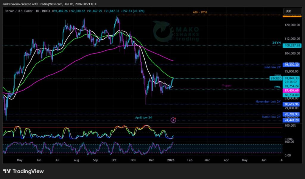 Medvede pohodlne vstupujú do nového roka, stále držia dominantnú pozíciu, obiehajú nad kryptosvetom s Nazgûlmi. Ideálne pre medvede je, aby zóna 95k/96k naďalej pôsobila ako odpor, zatiaľ čo akákoľvek denná uzávierka pod PWL na úrovni 87,6k by takmer určite poslala Bitcoin do výzvy na “novembrové minimum '24” na úrovni 80,6k, pretože opakované zlyhania v získavaní tohto minima pokračujú v generovaní nového predajného tlaku.