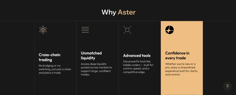Jednou z hlavných inovácií Asteru je možnosť používať aktíva generujúce výnos ako kolaterál. Obchodníci môžu udržiavať otvorené pozície a zároveň získavať stakingový výnos, čím vzniká dvojitý výnos a efektívnejšie využitie kapitálu. Platforma tiež ponúka perpetualy na akcie, umožňujúce 24/7 obchodovanie s americkými akciami, ako sú Apple a Tesla, zúčtované v USDT. Funkcie súkromia, ako Hidden Orders, chránia obchodníkov pred front-runningom a inými exploitmi.