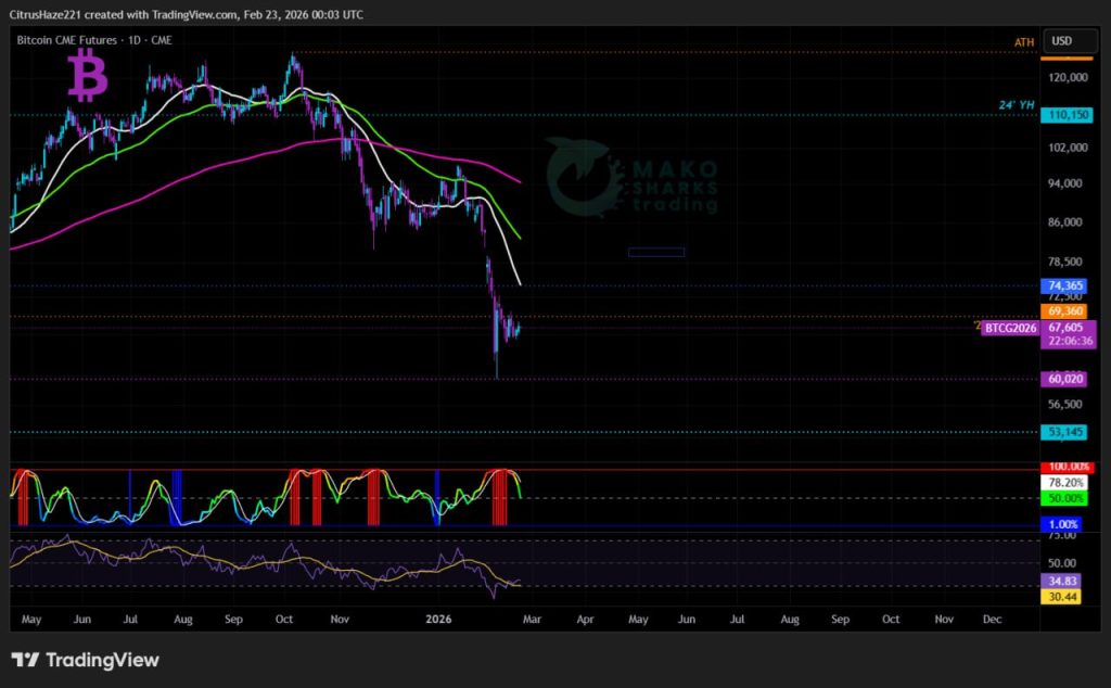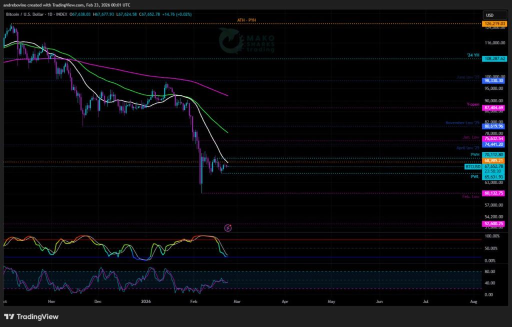 Na strane medveďov tiež žiadne výrazné zmeny… V ideálnom prípade medvede potrebujú akékoľvek denné uzavretie pod februárovým minimom 60,1k, aby potvrdili nové nižšie minimum a pravdepodobne posunuli BTC do zóny 50k okolo 52k/55k. V tomto scenári medvede chcú, aby BTC zostal pod denným 21SMA 68,4k a zabezpečil denné uzavretie pod PWL 65,6k, čo by pravdepodobne obnovilo predajný tlak a posunulo BTC k testovaniu krehkého februárového minima 60,1k ako kľúčového krátkodobého otočného bodu smerom nadol. 🥶 💩 ⛔️