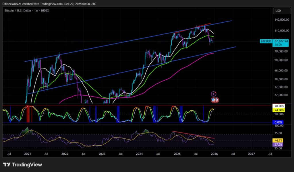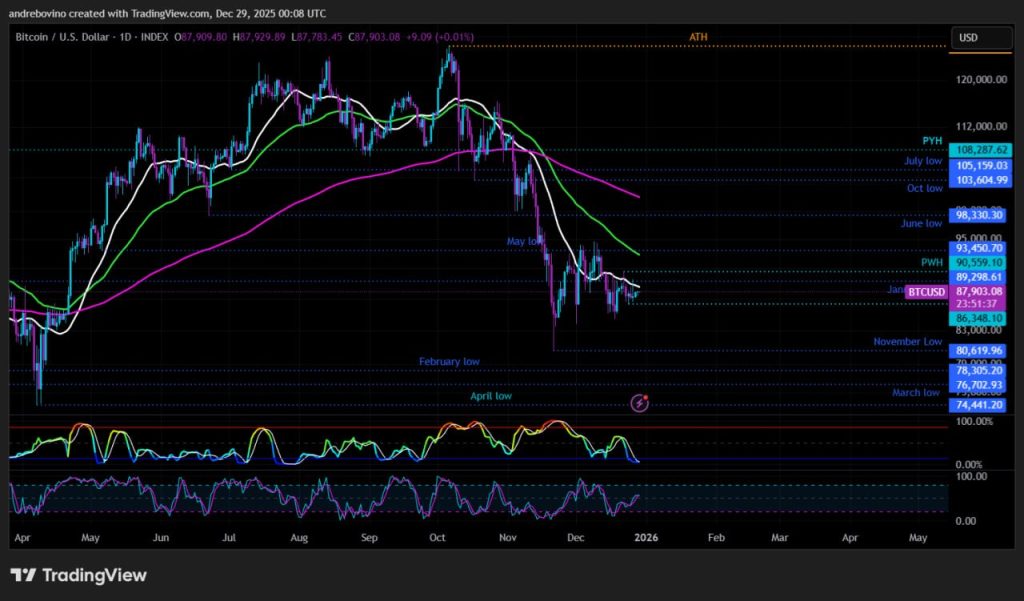 Bitcoin začína týždeň na úrovni 87,9 tisíca! Bitcoin sa počas vianočného týždňa obchoduje pokojne, pohybuje sa do strany a naďalej stagnuje okolo denného 21SMA, zatiaľ čo indikátory Stoch aj RSI zostávajú v negatívnom pásme. Rozsah medzi maximom minulého týždňa (PWH) na 90,5 tisíca a minimom minulého týždňa (PWL) na 86,3 tisíca sa zužuje, čo naznačuje, že sa blíži rozhodujúci pohyb. Kryptosvet sa tento rok dočkal Vianoc bez „Santa rally“ a plameň Hopia slabne. Dokážu býci ukázať rohy a pokúsiť sa zaútočiť na denný 55EMA a májové minimum na 93,4 tisíca, aby znovu zapálili iskru nádeje, alebo sa medvede opäť prevezú s Nazgûlmi až do konca roka, pozametajú Sell Side Liquidity (SSL) pod novembrovým minimom na 80,6 tisíca a otvoria dvere k zóne 70 tisíc? 🦌 ☕️ 🤭