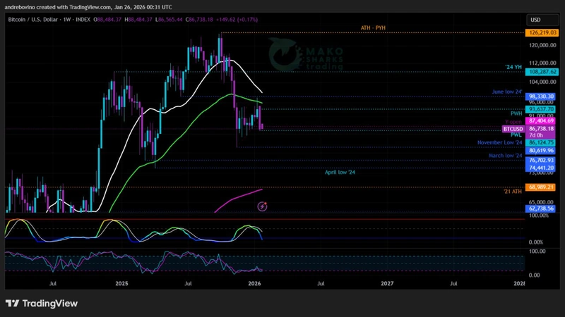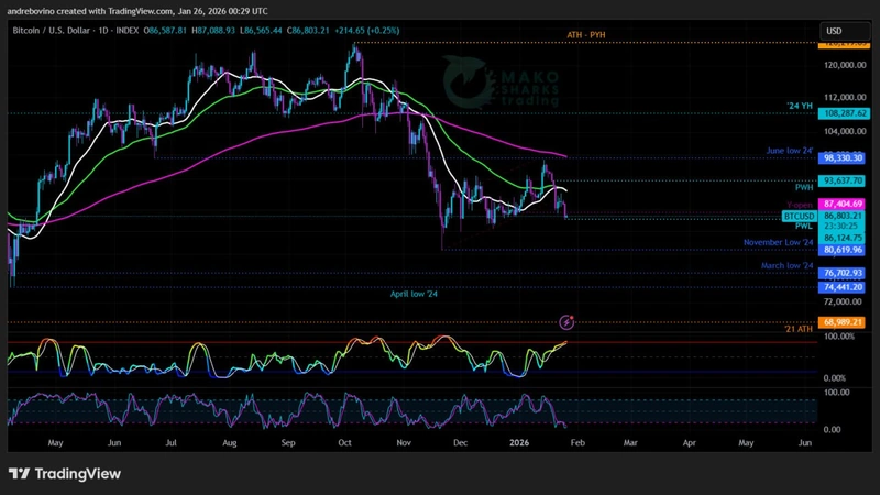 Medvede si mädlia ruky, zatiaľ čo Nazgûls krúžia nad kryptosvetom. Týždenný 55EMA na úrovni 96,1k odmietol Bitcoin a potvrdil sa ako odpor, po čom nasledovalo obchodovanie pod mesačným 21SMA na úrovni 88,9k a ročným otvorením na úrovni 87,4k, a zdá sa, že je len otázkou času, kedy sa testuje minimum z 24. novembra na úrovni 80,6 tis., ktoré v súčasnosti vyzerá ako tenký ľad, oddeľujúci Bitcoin od strednej až nízkej zóny 70 tis., kde by mohla nastať ďalšia významná býčia reakcia a pokus o odraz. Úloha medveďov zostáva nezmenená: zabezpečiť akékoľvek úspešné denné uzavretie pod minimom z 24. novembra na úrovni 80,6 tis., čo by efektívne otvorilo brány Mordoru. V ideálnom prípade pre medveďov zostáva kľúčové udržať sa pod ročným otvorením na úrovni 87,4 tis. a mesačným 21SMA 88,9 tis., pričom udržanie sa pod PWH 93,6 tis. na dennej báze by malo samo o sebe stačiť. 😎 😈 😇