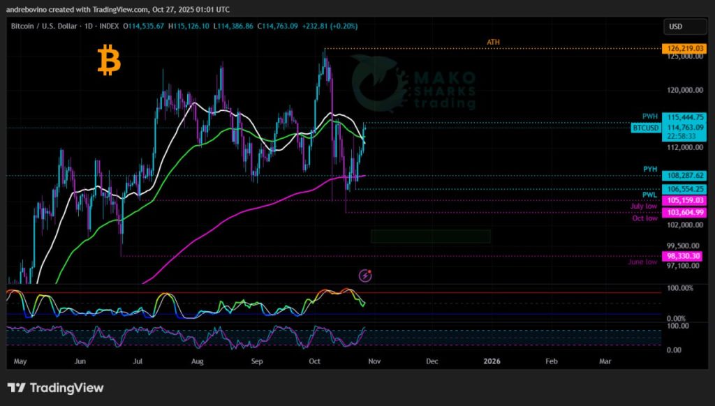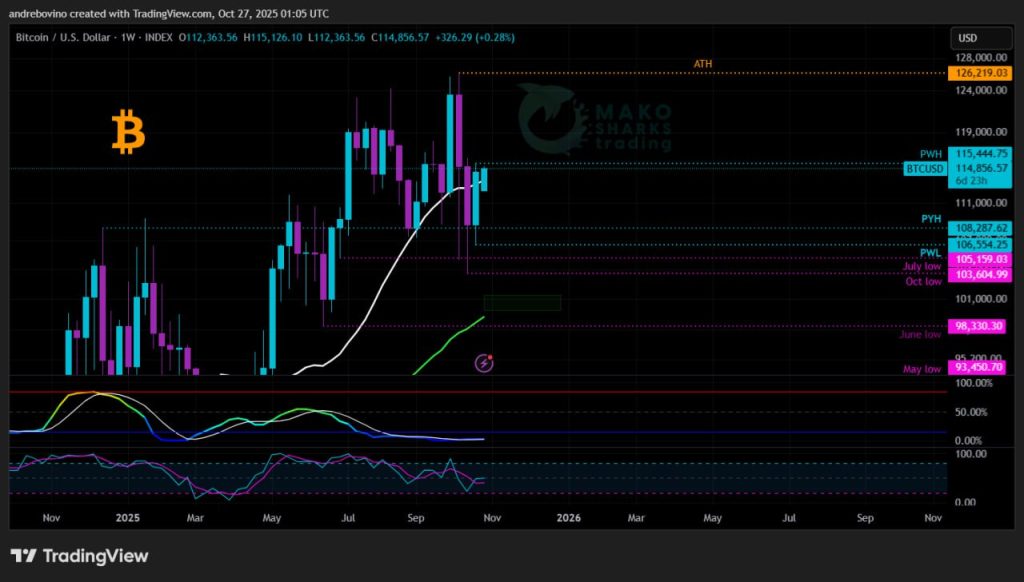 Počas minulého týždňa sa Bitcoin pohyboval v pásme medzi denným 21SMA 112,5 tis., 55EMA 113,7 tis. a 200EMA 108,2 tis.. Vďaka nedeľnému prelomu sa mu podarilo dostať nad 21SMA aj 55EMA. Pre býkov je teraz extrémne dôležité dosiahnuť týždenné uzavretie nad 21SMA 113,4 tis., a ideálne získať viacero denných uzavretí nad maximom z minulého týždňa (PWH) 115,4 tis., čo by potvrdilo silu a otvorilo cestu k vyšším rezistenciám.