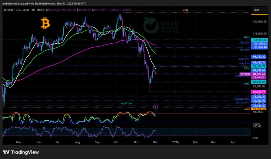 Bitcoin začína týždeň na úrovni 90,3k! Momentálne sa Bitcoin len ťažko prediera „Gollumovými jaskyňami“. Situácia ostáva takmer nezmenená oproti minulému týždňu a býci sa opäť ocitajú na „tenkom ľade“ pri mesačných a týždenných uzávierkach/otváraniach.